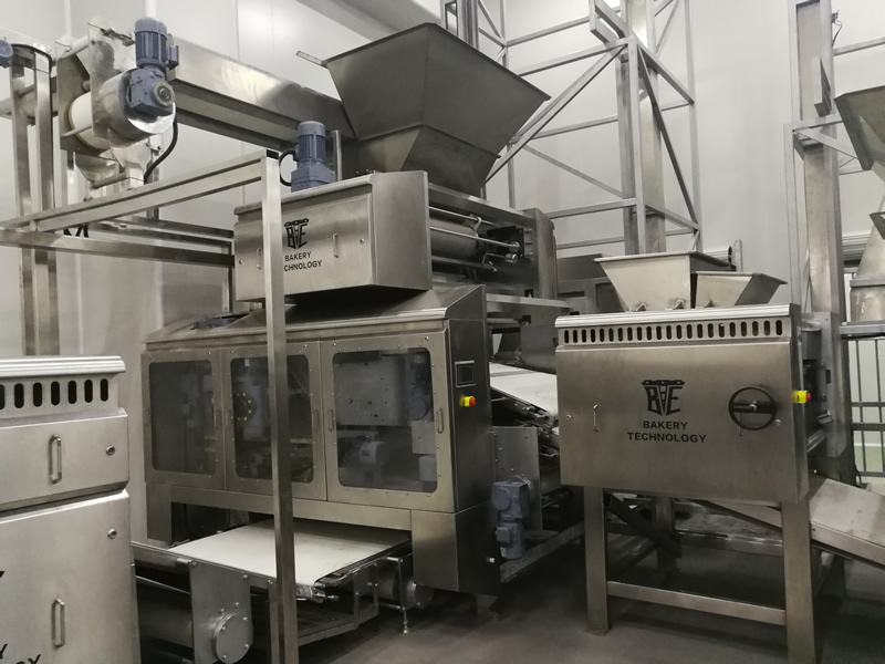 面團通過疊層機三次壓軋,切片疊加至8~16層面皮。輸送至成型軋輥,該機能將回面始終處于面 皮底部,經切片式疊層機生產出來的餅干層次感 強、口感松脆、酥化程度極高,配合機器上的撒 酥機,可生產蘇打餅干和其它高檔餅干。